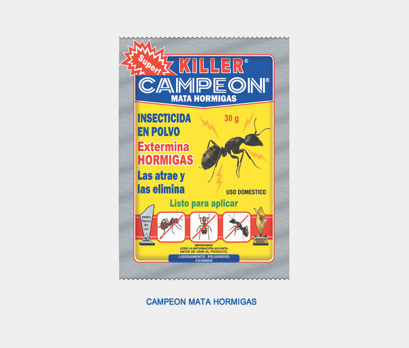 KILLER CAMPEON POLVO SECO MATA HORMIGAS, es un insecticida piretroide de gran eficacia y largo poder residual, exterminando toda clase de insectos rastreros por contacto e ingestión, no representando ningún peligro para el hombre, los animales y la vida silvestre.